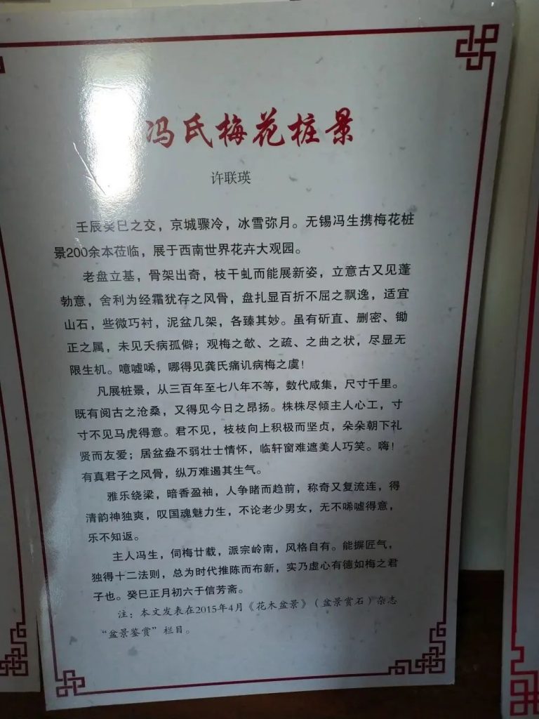 无锡冯氏梅园园艺科技有限公司前身为无锡市钱桥镇藕塘东风园艺场,种植面积400余亩,其中惠山区前洲镇160亩、藕塘和胡埭交界处的无锡花都100多亩、以梅花盆景为主,品种有朱砂、宫粉、玉蝶、绿萼等。多年来,冯氏梅花盆景受邀到北京植物园、北京花卉大观园、长沙植物园等地巡展,在承德、洛阳等城市留下自己足迹。梅花栽培领域权威展会全国梅展中,该公司先后捧回12座金奖、20座银奖。同时,宣传梅花文化、发展梅花事业方面,也起到巨大推动作用。为此,受到中国梅花协会多次表扬。